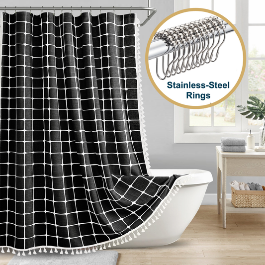 Tassel Shower Curtain and Stainless-Steel Hooks Set, 330 GSM, 72 x 72 in
