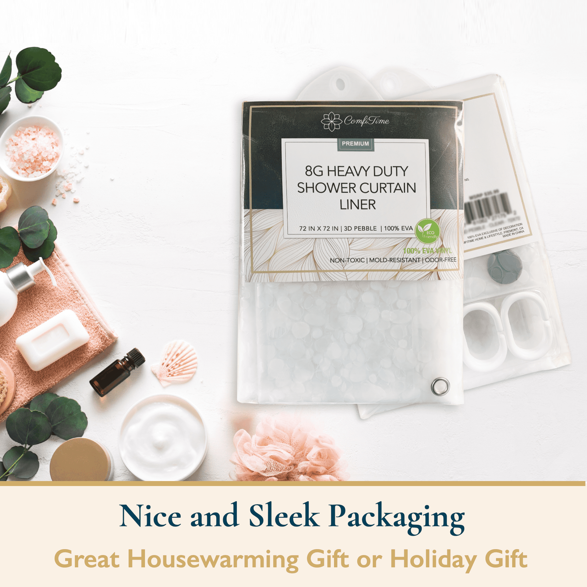 - Made to Last - ComfiTime shower curtain liners are designed to last. We use 8G material which means a thickness 30%-100% greater than most shower curtain liners on the market. Plus, the heavy-duty EVA material not only provides good gloss and clarity but also remains strong at low temperatures and retains its resistance to UV radiation and stress cracking. From material to design, we go the extra distance to ensure our shower curtain liners rise above the rest.