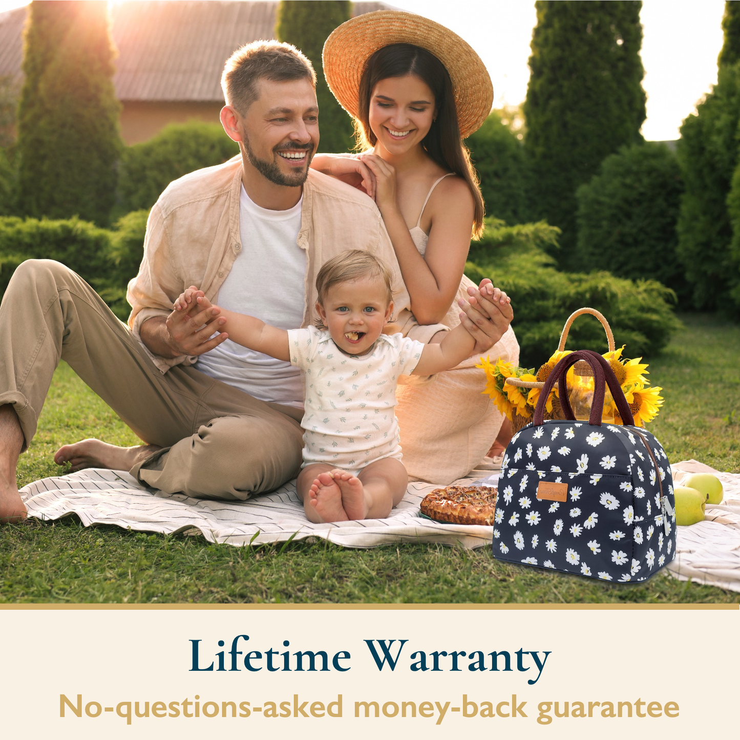 Made to Last - Our lunch bag is backed by our LIFETIME WARRANTY. It is made of high-quality materials and reinforced with strong stitches. The large metal zipper heads are durable and easy to grasp. The half-inch-thick rounded handles are comfortable to hold and can safely bear up to 30 lbs. of weight.