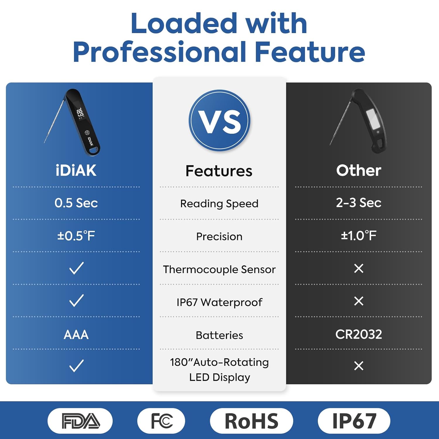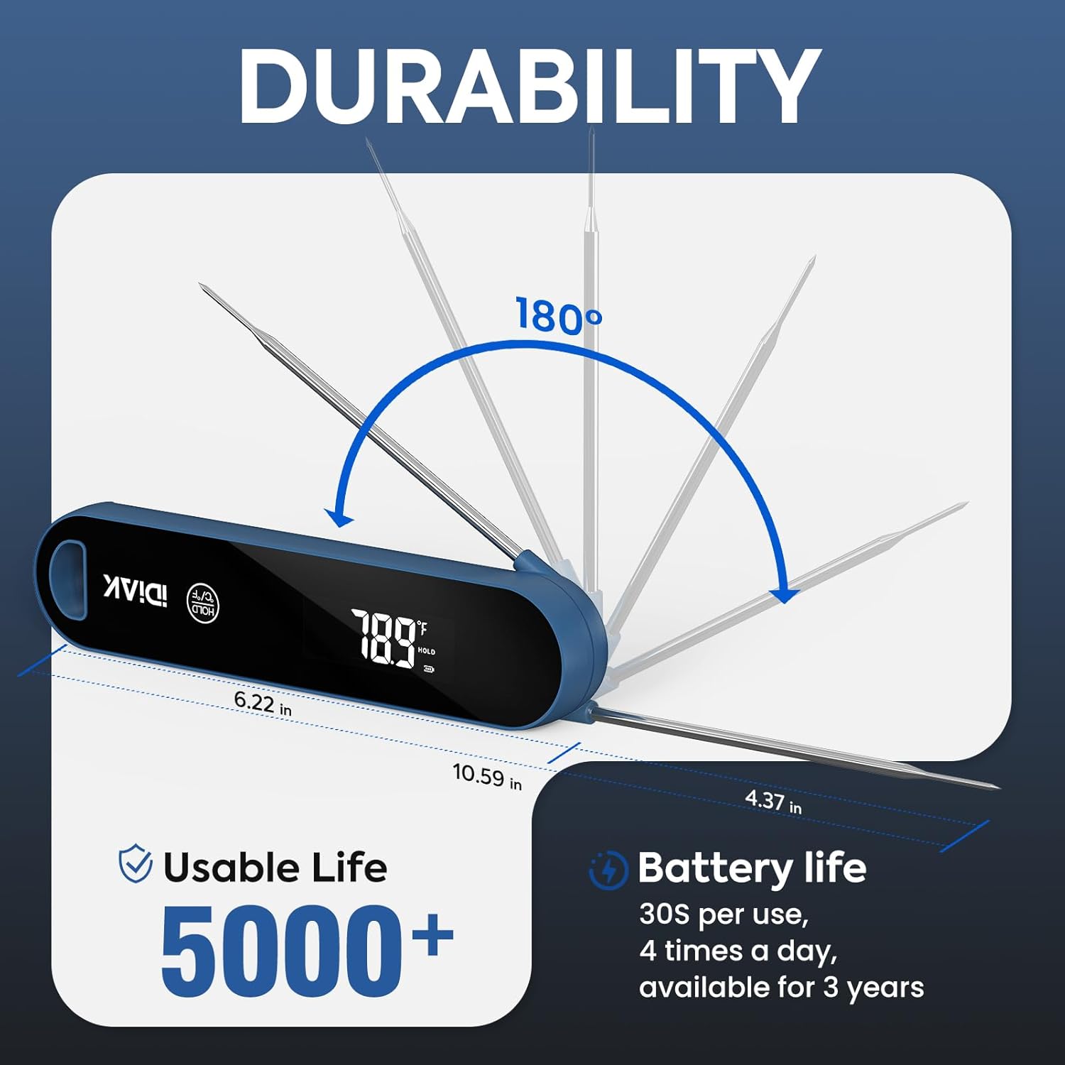 🥓 Folding Design - Our probe folds away just enough for compact storage and those hard-to-reach places you need to measure.